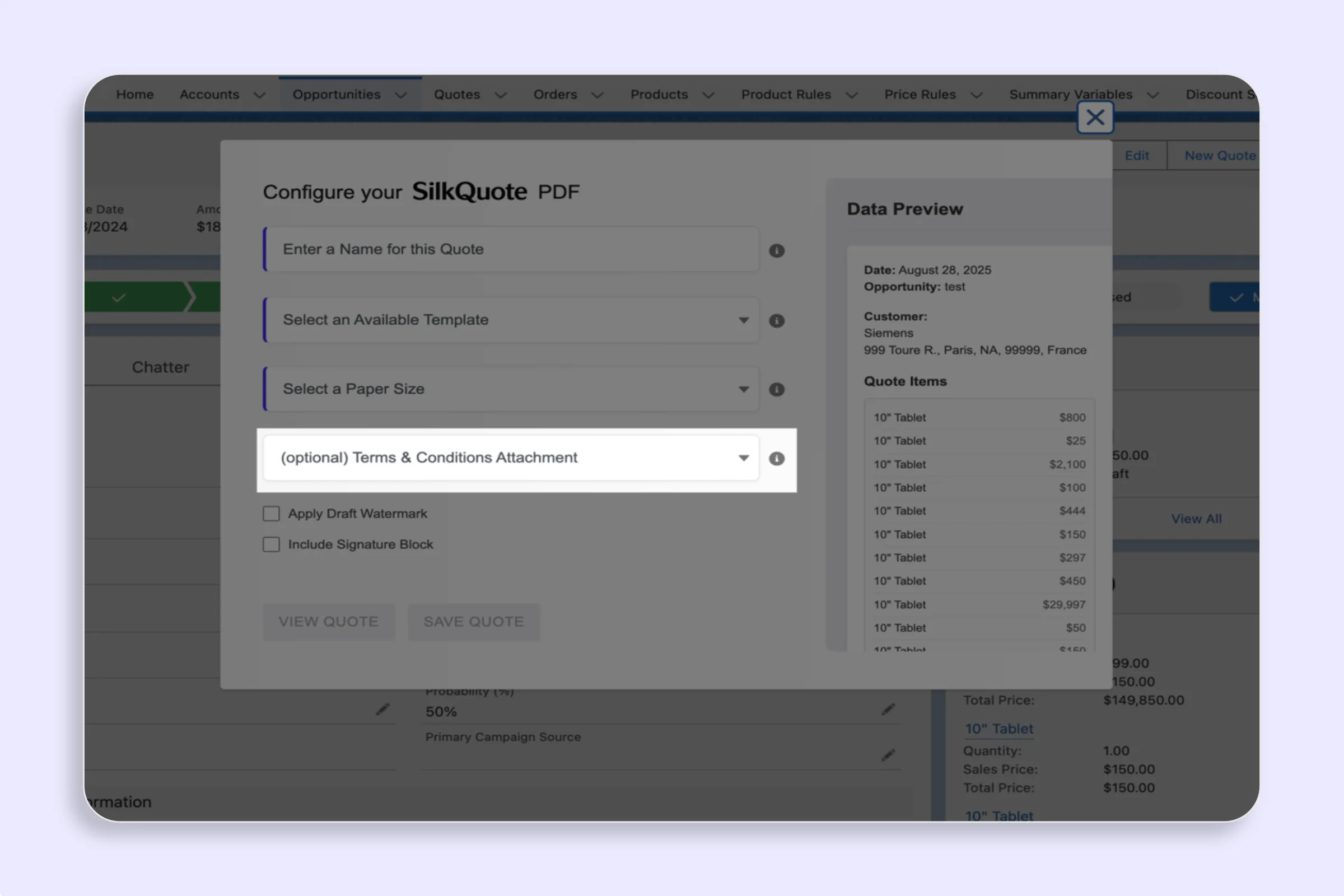 SilkQuote can append a Terms and Conditions page to any generated quote PDF. Terms are configured by an admin as named rules with optional conditions. The system can automatically include different terms based on the Opportunity data, or present the rep with a selection of applicable options at generation time.