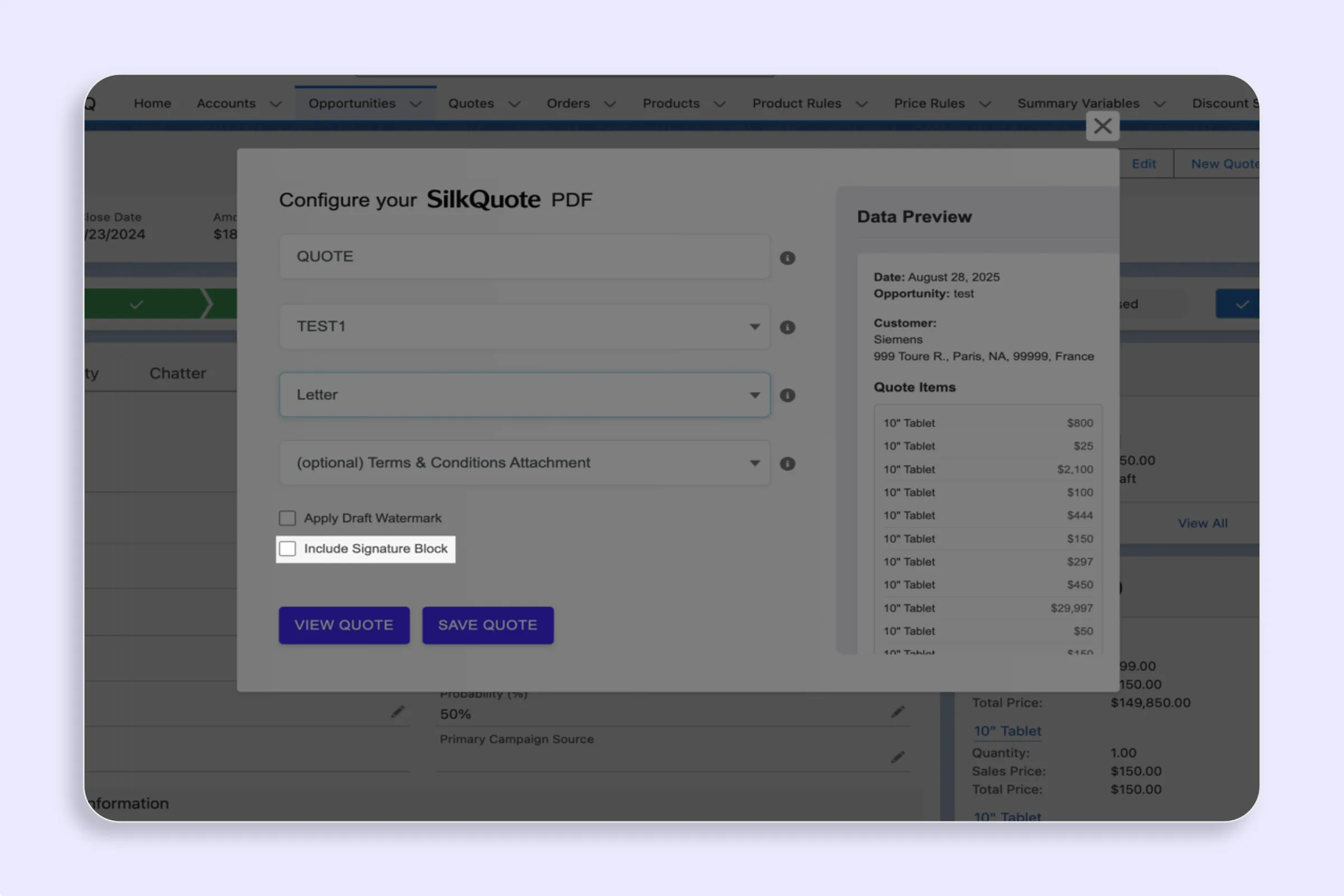 Note: For most quoting scenarios, SilkQuote’s built-in prospect acceptance feature (the shared link with Accept/Decline buttons) is faster and provides better tracking. Reserve the signature block for situations that genuinely require a physical or e-signature on the document. See integrating e-signatures with Salesforce quotes for guidance on when each approach is appropriate.