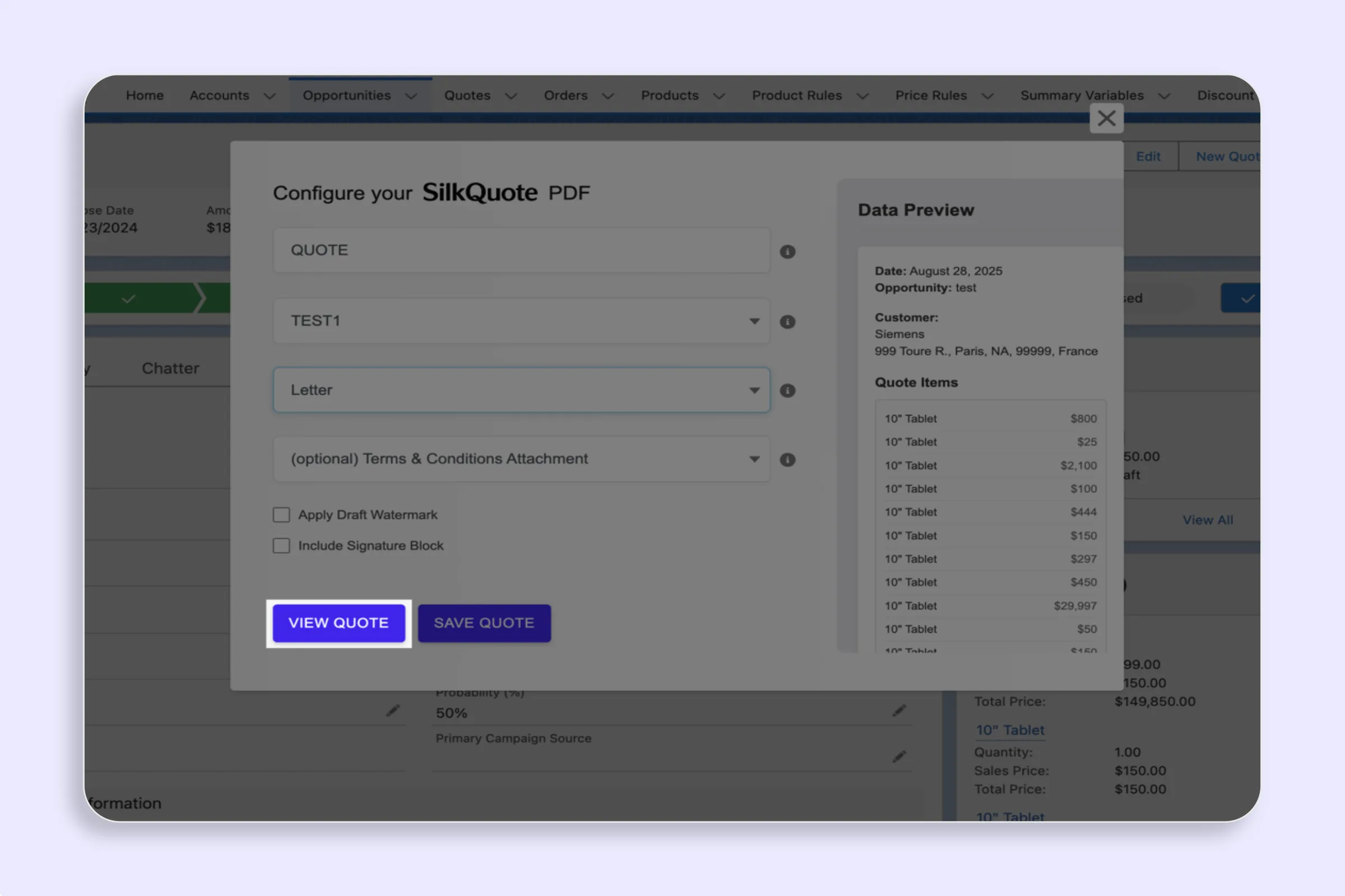 Yes. SilkQuote includes a preview mode that renders the PDF using live Opportunity data without saving it to the record. Reps can verify the output (field values, layout, totals, and terms) before committing the document. The preview matches the final PDF exactly.