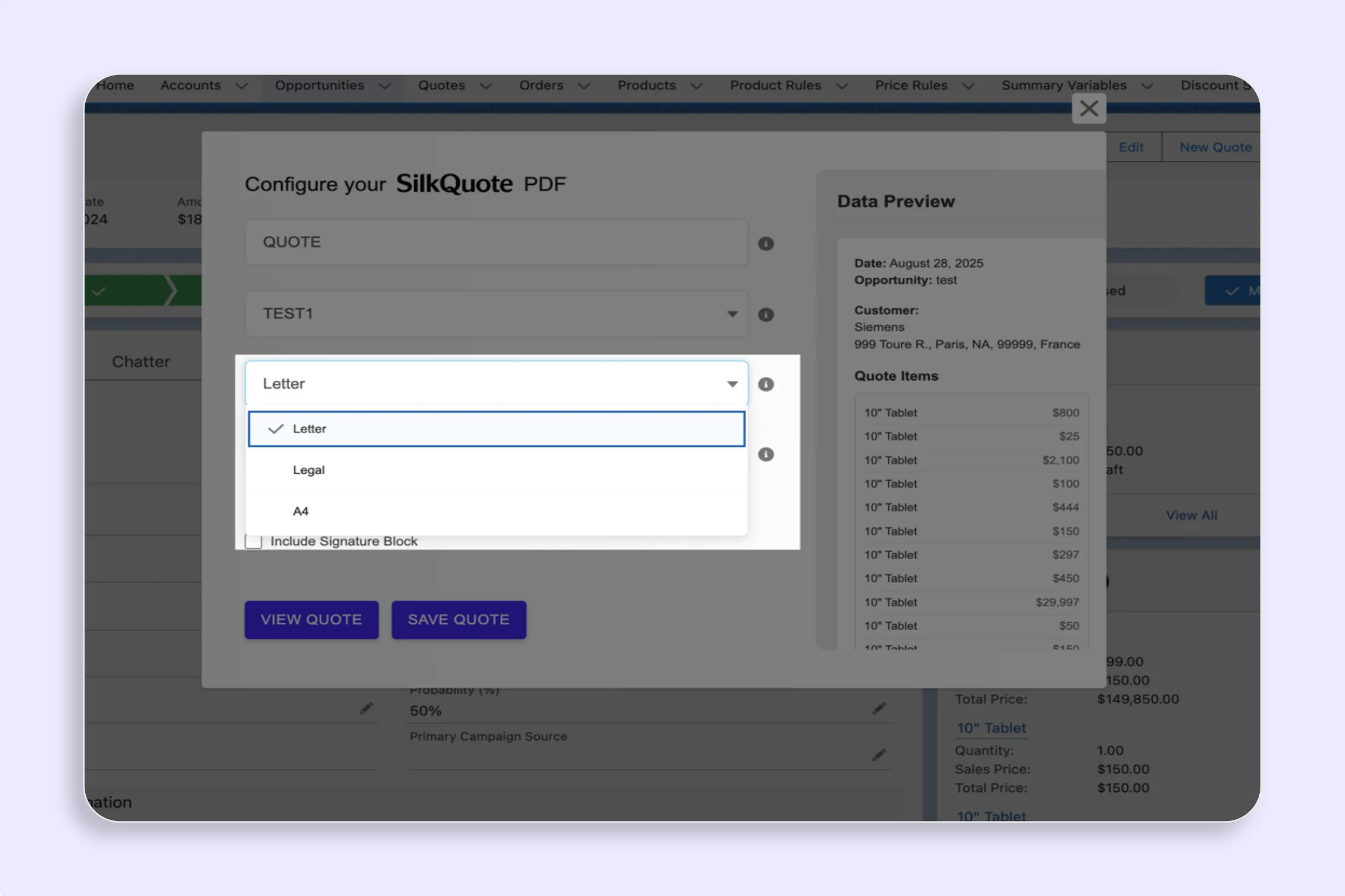 - Preview before saving: Use the View Quote preview option to verify that content fits correctly in the selected paper size, especially for quotes with many products.